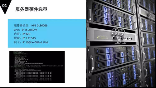 这是我们移动云的一些服务器的选型:采用的服务器是惠普的 DL360G9,CPU是 2 核×e5-2650V4,内存是 8×32G,硬盘是 6×1.2TSAS,网卡是 4×10GE+4×1GE+1IPMI。