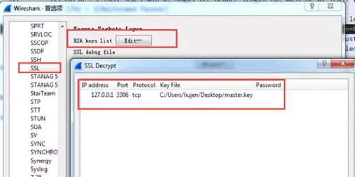 下载mysql服务端的证书私钥,也就是之前说的master.key文件,然后打开wireshark的首选项进行协议配置: