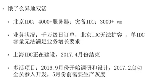 当时,我们峰值的业务订单数量已经接近了千万级别,但是基本上北京机房(IDC)已经无法再扩容了,也就是说我们没有空余的机架,没有办法添加新的服务器了,必须要再建一个新的机房。