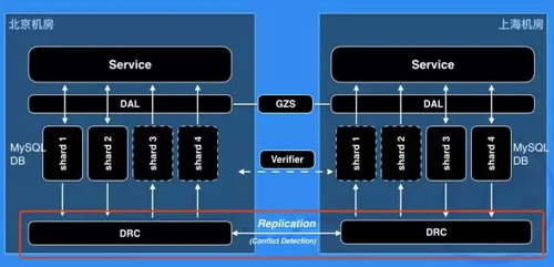 这是异地多活的底层数据同步实施的一个简单的概要图,大家可以看到,我们有两个机房,一个是北京机房,一个是上海机房。