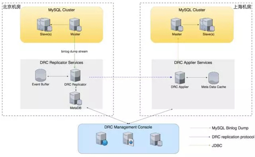 以上所有的因素,都需要底层数据库的数据之间是打通的。而今天我所要分享的 DRC 项目就是饿了么异地 MySQL 数据库双向复制的组件服务,即上图中红色框标记的部分。