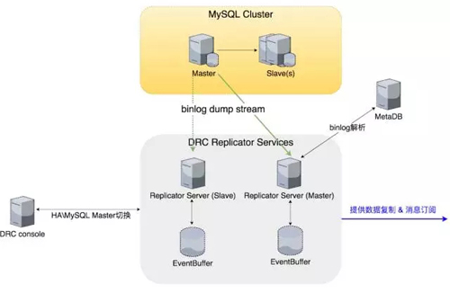 这是 DRC 复制组件的总体架构设计。我们有一个组件叫 Replicator,它会从 MySQL 集群的 Master 上把 binlog 日志记录抽取出来,解析 binlog 记录并转换成我们自定义的数据,存放到一个超大的 event buffer 里面,event buffer 支持 TB 级别的容量。