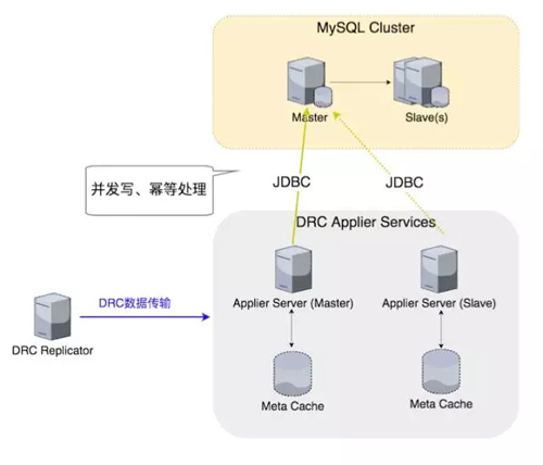 往目标的 MySQL 集群复制写的时候,由 DRC Applier Server 负责,它会建一个长连接到 Replicator 上去,Replicator PUSH 数据给 Applier。