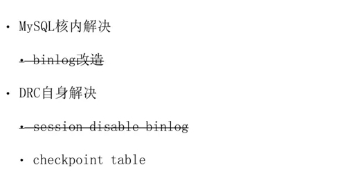 所以我们最后选择的是第二个办法,通过把事务往目标 DB 复制的时候,在事务中 hack 一条 checkpoint 的数据来标识事务产生的原始 server,DRC 在解析 MySQL binlog 记录时就能正确分辨出数据的真正来源。