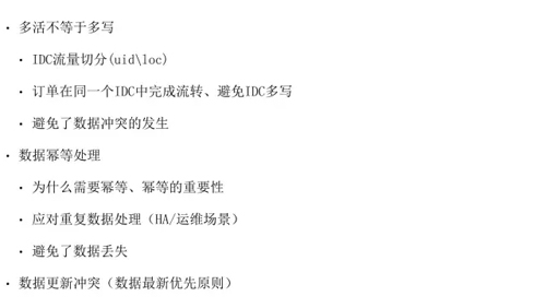 我们最怕的是同一个数据同时或者是在相近的时间里同时在两个机房被修改,我们怕的是这个问题,因为这种情况就会引发数据冲突。所以我们通过合理的流量切分,保证绝大部分时候数据是不会冲突的。
