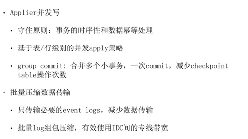 并发策略在提供复制吞吐能力,降低复制延迟上起到决定的作用,还有幂等也是非常重要的,后面有很多运维操作,还有一些 Failover 回退操作,会导致发生数据被重复处理的情况,幂等操作保障重复处理数据不会发生问题。