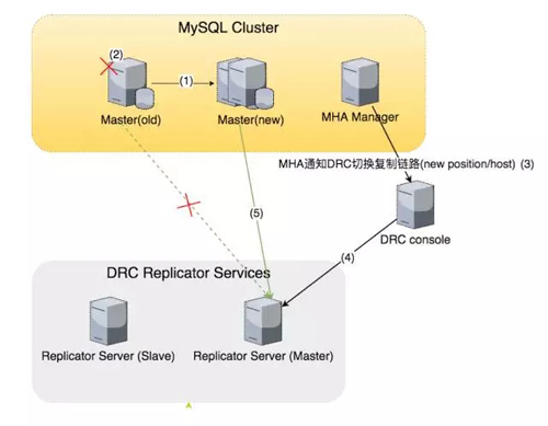 目前的解决方案是 DBA 系统的 MHA 工具会通知 DRC 控制中心,DRC 的控制中心会找到对应的复制链路,然后把复制链路从老的 Master 切到新的 Master。