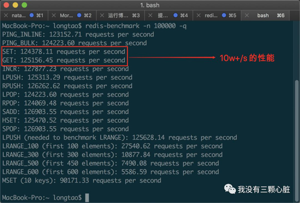 当你安装完成之后,你可以先执行 redis-server 让 Redis 启动起来,然后运行命令 redis-benchmark -n 100000 -q 来检测本地同时执行 10 万个请求时的性能: