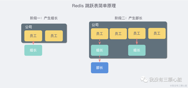 跳跃表就类似于这样的机制,最下面一层所有的元素都会串起来,都是员工,然后每隔几个元素就会挑选出一个代表,再把这几个代表使用另外一级指针串起来。然后再在这些代表里面挑出二级代表,再串起来。最终形成了一个金字塔的结构。