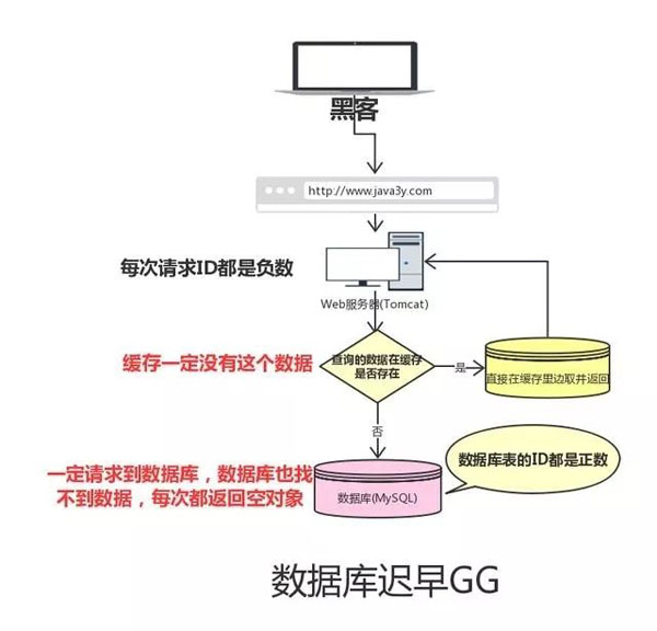 由于请求的参数是不合法的(每次都请求不存在的参数),于是我们可以使用布隆过滤器(BloomFilter)或者压缩filter提前拦截,不合法就不让这个请求到数据库层!