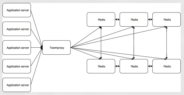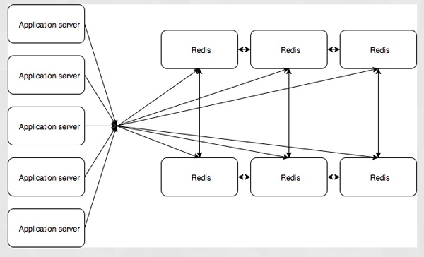 将会有大量的应用服务器与 twemproxy 进行通信,这会将它们的调用路由到合适的 Redis 主节点,twemproxy 将从 sentinal 集群获取主节点的信息,它将控制哪台 Redis 实例是主,哪台是从。这个设置是复杂的,而且仍有单点故障,它依赖于 twemproxy 来处理分片,来连接到正确的 Redis 实例。它具有对应用程序透明的优点,所以我们可以在理论上做到将现有的应用程序转移到这个 Redis 配置,而不用改变应用程序。但是我们要从头开始构建一个应用程序,所以迁移应用程序不是一个必需条件。
