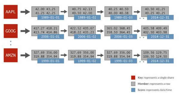 用于这番横向比较的时间序列数据包括:随机生成的金融数据,每天1024支股票,时间范围是32年。每只股票由各自的有序集合来表示,分数是日期,数据成员包括开盘价、***价、***价、收盘价、成交量以及调整后的收盘价。下图描述了用于Spark分析的Redis有序集合中的数据表示: