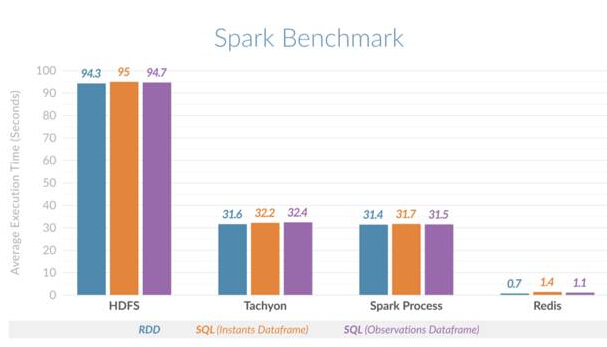 为了展示给Spark带来的好处,Redis团队决定在几种不同的场景下执行时间片(范围)查询,以此横向比较Spark中的时间序列分析。这几种场景包括:Spark在堆内内存中存储所有数据,Spark使用Tachyon作为堆外缓存,Spark使用HDFS,以及结合使用Spark和Redis。