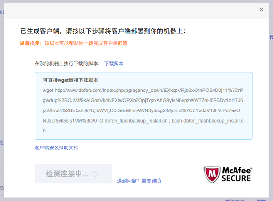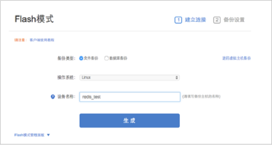 在创建备份任务选项中,选择生成客户端,复制对应脚本至终端中执行,即可自动下载并安装Flash客户端。