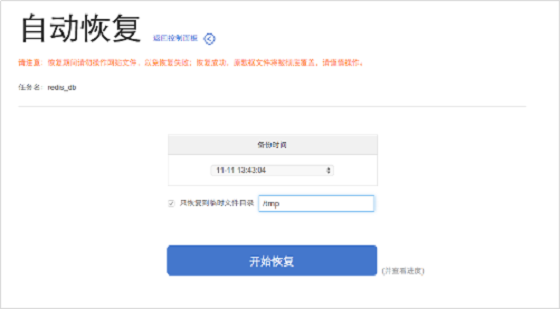 当Redis出现故障时,用户可通过多备份平台快速恢复Redis业务,用户只需要两步即可开启Redis恢复。