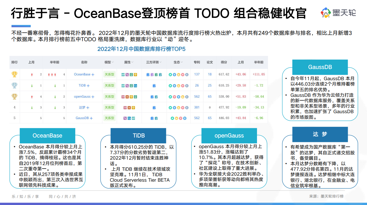 2022年12月的墨天轮中国数据库流行度排行榜风起云涌,相比上月新增3个数据库,共249个数据库参与排名。本月排行榜前十用一句话可以概括为:榜单前十一片红,TODO 格局重洗牌,TDSQL 排名上升,数据库行业以“动”迎冬。OceanBase 本月摘得桂冠,得分较上月上涨7.5%,这也是其自2019年12月位列榜首后,第二次重夺第一;TiDB 以7.37分的分数劣势暂退第二,暂时结束连胜神话;openGauss 本月获得了“探花”称号,得分较上月上涨51.83分,涨幅达到了10.7%;TDSQL 本月排名上升一位获得第八名。