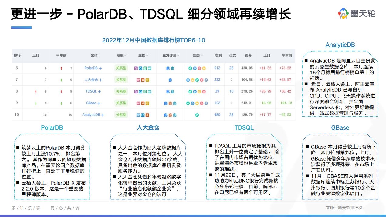 12月《中国数据库行业分析报告》已正式发布(点击即可跳转,欢迎大家下载查阅),本期报告盘点了墨天轮“中国数据库流行度排行”、国内外产品发布、评测以及投融资等最新情况,以此呈现当前数据库市场发展前沿动态。