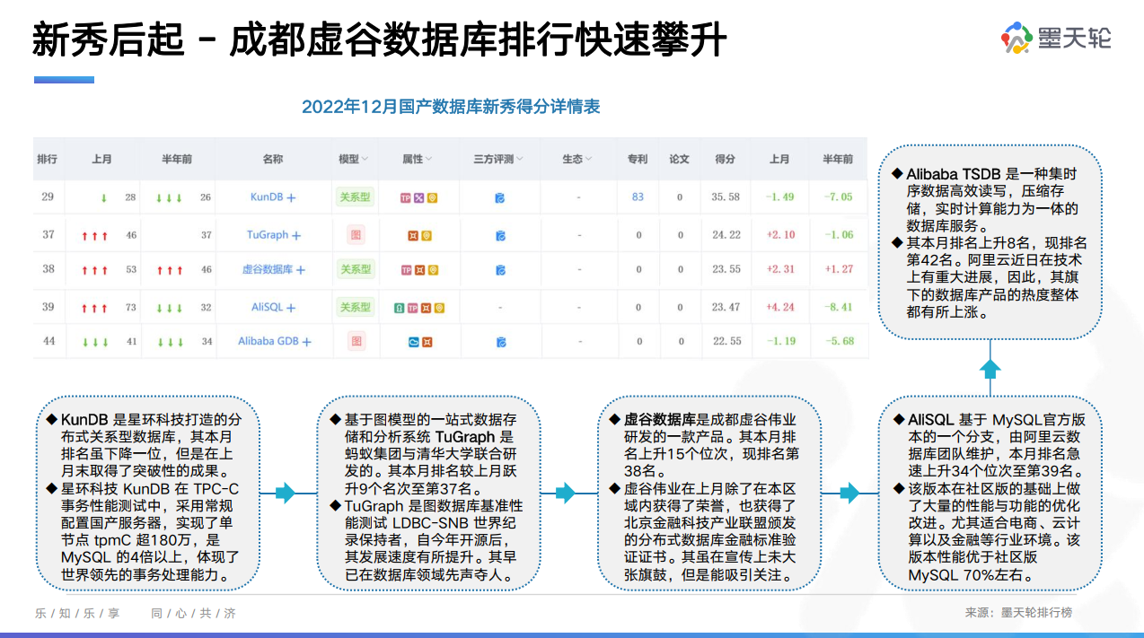 本月排行榜中有一批数据库能抓住时机,找准道路,获得了良好的成绩。诸如成都虚谷伟业研发的虚谷数据库本月排名上升15个位次,现排名第38名;由蚂蚁集团与清华大学联合研发的基于图模型的一站式数据存储和分析系统 TuGraph ,本月排名较上月跃升9个名次至第37名;AliSQL 是基于 MySQL官方版本的一个分支,由阿里云数据库团队维护,本月排名急速上升34个位次至第39名;Alibaba TSDB 本月排名上升8名,现排名第42名。