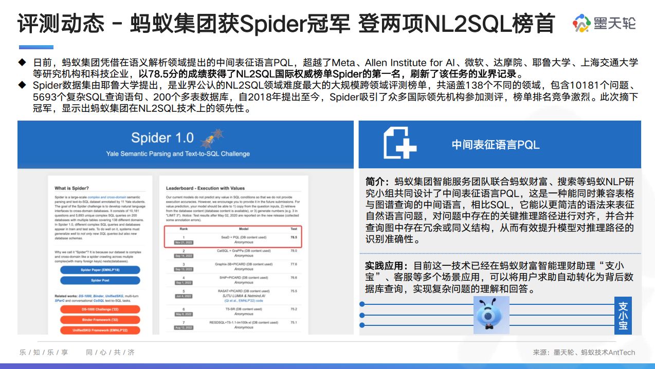 业内调研、测评层面,2022年 Gartner 云数据库魔力象限公布,阿里云依旧处于领导者象限,腾讯云重新入选并进入特定领域者象限,是国内入选的仅有两家企业。星环科技 KunDB 在 TPC-C 事务性能测试中,采用常规配置国产服务器, 实现了单节点 tpmC 超180万,相对于号称世界上最快的分布式关系型数据库SingleStore(原名MemSQL)每秒150万次事务,提升了22.6%。蚂蚁集团凭借在语义解析领域提出的中间表征语言 PQL,超越了 Meta Allen Institute for AI 、微软、达摩院、耶鲁大学、上海交通大学等研究机构和科技企业,以78.5分的成绩获得了 NL2SQL 国际权威榜单 Spider 的第一名,刷新了该任务的业界记录。