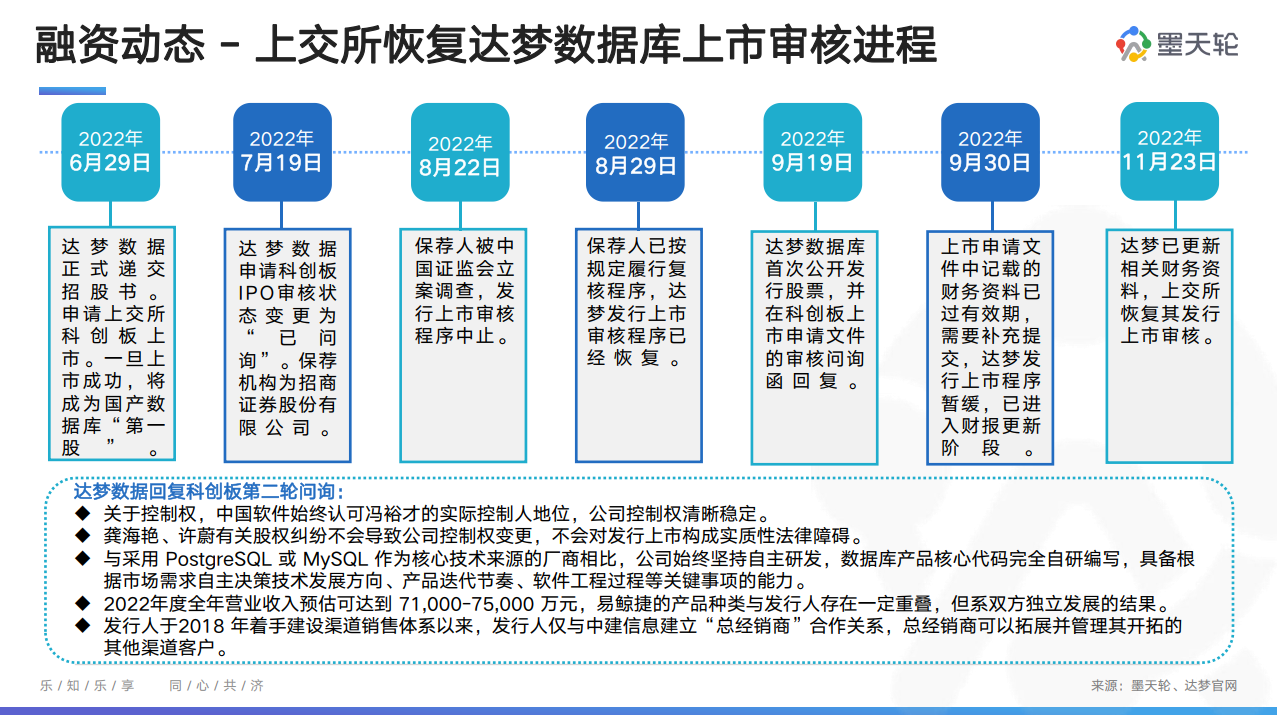 融资层面,基于开源数据库 DuckDB 构建无服务器、流线型数据分析平台的企业 MotherDuck 宣布最近获得 4750 万美元的融资里程碑。数据库初创公司 EdgeDB 宣布完成 1500 万美元A轮融资,本轮融资由 Nava Ventures 和 Accel 领头。报告对这两款产品及其特性功能进行了展示,此外梳理了达梦数据库自今年6月递交招股书至当前上交所恢复其发行上市审核的进展流程图,大家均可查阅报告了解详情。