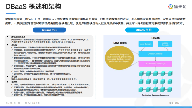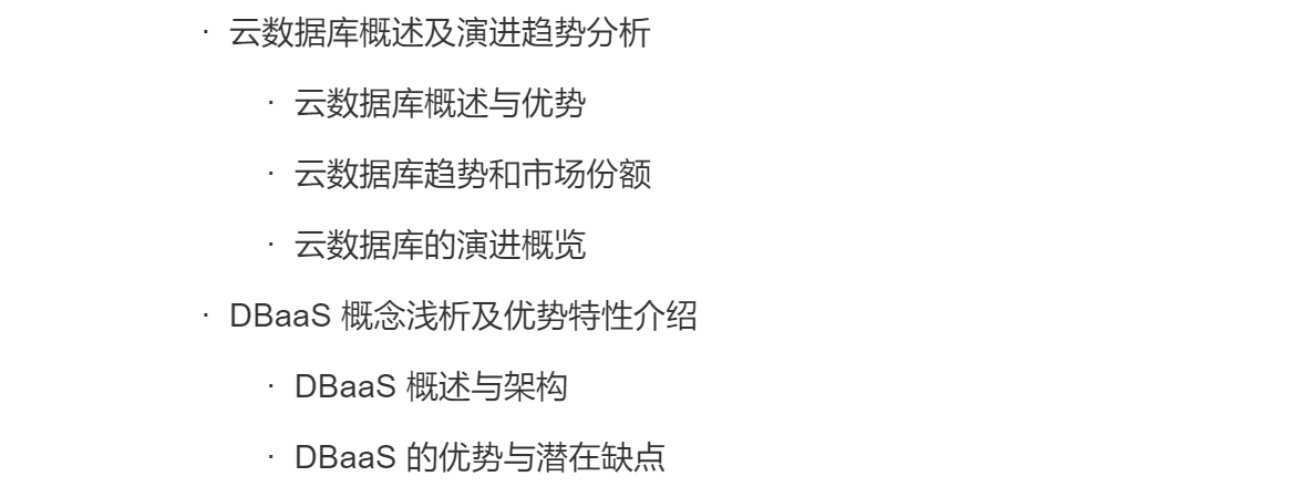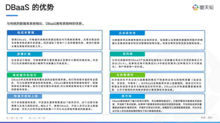 数据库即服务(DBaaS)是一种利用云计算技术提供数据应用托管的服务,它提供对数据库的访问,不需要设置物理硬件 安装软件或配置数据库。与传统的数据库系统相比,具有其独特的优势。报告则对 DBaaS 的架构、特征、优势进行了分析,但好似一把双刃剑,DBaaS 也存在潜在的缺点,报告也总结了其8个潜在问题。与内部系统相比,缺乏对IT基础设施的控制通常是DBaaS最重要的问题,组织的IT团队无法直接访问用于运行这些数据库的服务器和存储设备,因此其必须依赖云供应商来有效地管理基础设施。此处仅展示其中部分,具体内容大家可以查阅报告。