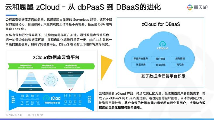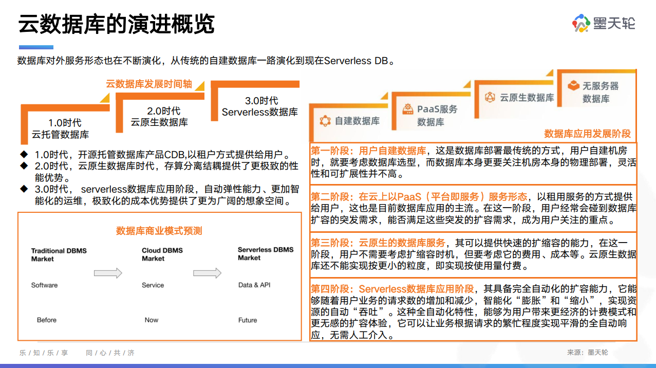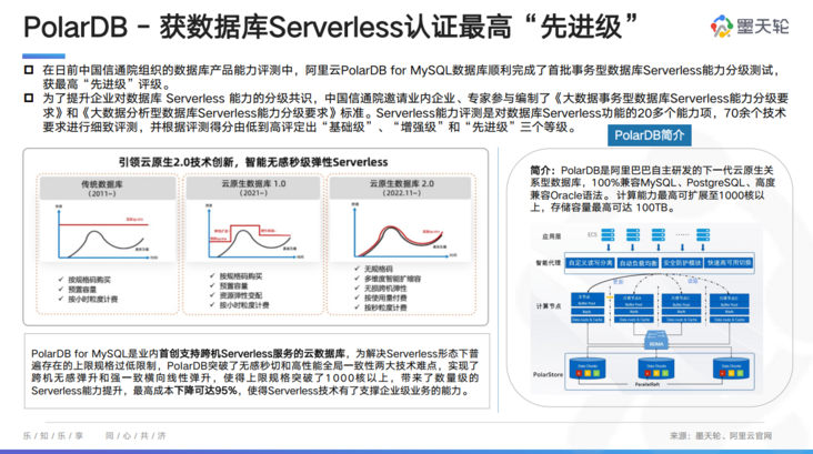 报告的最后选取了几款数据库和生态产品的 Serverless 及 DBaaS 发展案例进行了展示,诸如云和恩墨的 zCloud 产品完成了从 dbPaaS 到 DBaaS的进化,将公有云的数据库能力带给私有云企业用户,持续助力数据库的自动化和服务器无感知;阿里云 PolarDB for MySQL 数据库已顺利完成首批事务型数据库 Serverless 能力分级测试,且获最高“ 先进级” 评级;TDSQL-C 推出的 Serverless 服务基于计算与存储分离的理念, 满足了客户在公有云计算环境下根据业务发展弹性扩展集群的刚性需求;PingCAP 的 TiDB Cloud Serverless Tier BETA 版正式发布,这款完全托管的全自动 HTAP 数据库服务能使开发者能够以最经济的方式部署其基础设施。欢迎各位朋友查阅报告了解其实现原理与技术价值。此处仅展示其中几张内容,大家可以下载报告获取更多内容。