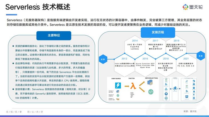据前文所述,Serverless 数据库将是云数据库的3.0时代,为了帮助大家了解这一下一代云数据库技术,本期报告第三章节首先是为大家介绍了 Serverless 技术的背景与主要特征与发展历程。Serverless(无服务器架构)是指服务端逻辑由开发者实现,运行在无状态的计算容器中,由事件触发,完全被第三方管理,其业务层面的状态则存储在数据库或其他介质中。Serverless 是云原生技术发展的高级阶段,可以使开发者更聚焦在业务逻辑,而减少对基础设施的关注。
