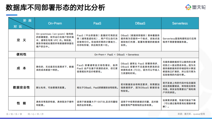 本章的最后,我们为大家梳理了数据库不同部署形态的对比分析的表格,从便利性、成本、数据安全性以及性能几方面对比了 On-premises、PaaS、DBaaS、Serverless 几种不同部署形态数据库,大家可以查看下方报告截图或查阅报告了解详情。此外,报告总结了 Serverless 数据库技术的8大发展趋势,包含屏蔽底层数据库操作,提升易用性;计算资源标准化,统一底层资源;资源快速调度,提升资源利用率等,大家可以通过报告查看详情。