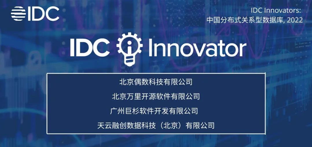 11月1日,国际知名研究机构 IDC 发布《IDC Innovator: 中国分布式关系型数据库,2022》报告,IDC基于对分布式关系型数据库市场中各初创厂商的综合分析,评选出4家公司作为该领域的创新者(排名不分先后):北京偶数科技有限公司(偶数科技)、北京万里开源软件有限公司(万里数据库)、广州巨杉软件开发有限公司(巨杉数据库)、天云融创数据科技(北京)有限公司(天云数据)。