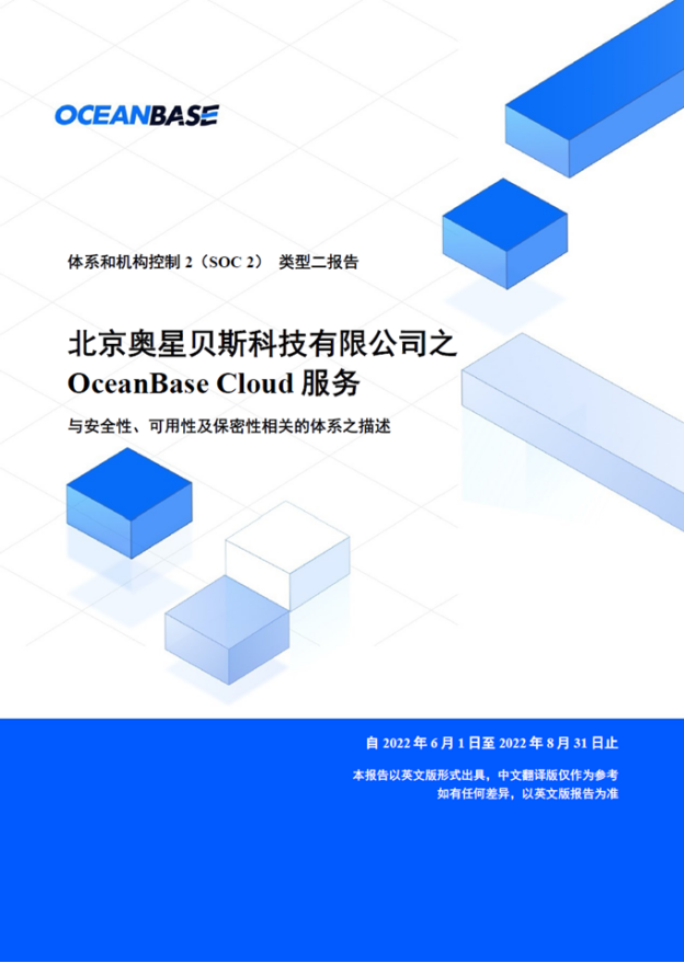 SOC2审计报告:即 Report on System and Organization Controls, 是由美国注册会计师协会(AICPA)指定的、针对服务商的内部控制情况进行审计而出具的第三方独立报告,是具有高度客观性、持续性和高认可度的详式报告,已经成为全球公认的数据安全审计标准。类型二报告体现了 OceanBase 已经按照 SOC 准则和标准要求,设计并实施了一套完善的内部控制体系和安全管理流程及技术。