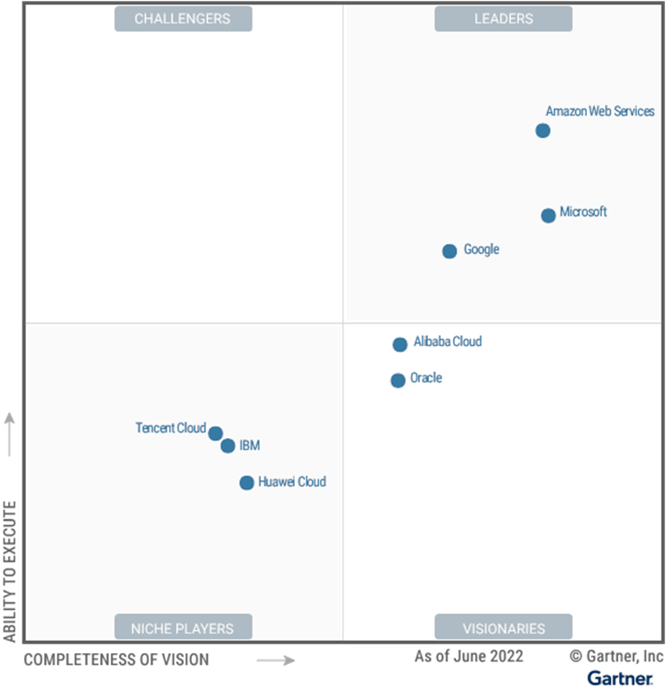 11月1日消息,Gartner 发布"2022年云基础设施和平台服务魔力象限"(Magic Quadrant for Cloud Infrastructure and Platform Services),报告中,AWS、微软、Google 被评为领导者,阿里云、Oracle 被评为远见者,:IBM、腾讯云、华为云被评为特定领域者,没有厂商被列为挑战者。