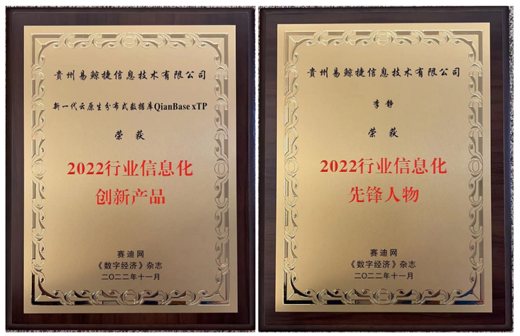- 易鲸捷自主研发的新一代原生分布式数据库QianBase xTP荣获了“2022行业信息化创新产品”奖,易鲸捷公司董事长李静荣获“2022行业信息化先锋人物”奖。