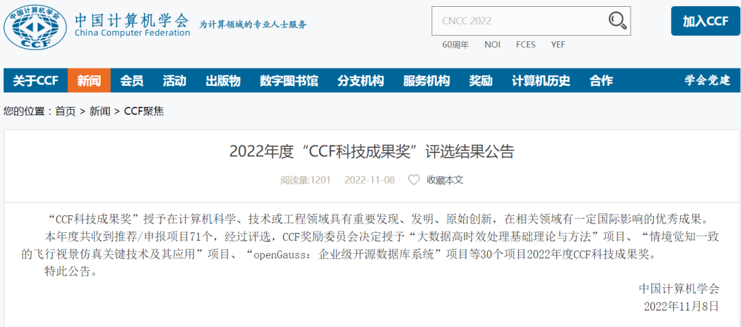 11月8日,根据中国计算机学会(CCF)发布的2022年度“CCF科技成果奖”评选结果,华为与清华大学、中国移动联合申报的“openGauss:企业级开源数据库系统”凭借在企业核心应用场景、在NUMA-Aware事务处理方法、主备共享存储技术、AI算子加速等核心技术创新获得组委会一致认可,最终获得2022年度“CCF科技成果奖”下设的“科技进步特等奖”(特等奖为该奖项中的最高级别奖项)。
