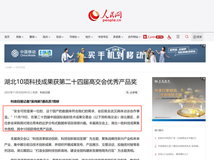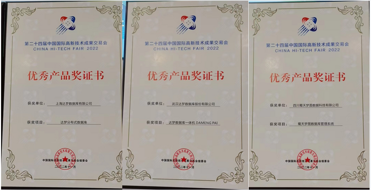 11月16日至20日,由商务部、科技部、工信部、发改委等部门共同举办的第二十四届中国国际高新技术成果交易会在深圳举行。达梦公司本次盛会不仅带来达梦数据库管理系统(DM8)等核心产品,还集中展示了达梦新云数据库等创新新品。其中达梦分布式数据库、达梦数据库一体机、蜀天梦图数据库管理系统被中国国际高新技术成果交易会组委会评选为“优秀产品奖”。达梦分布式数据库成功应用在福建移动核心大数据系统中,并助力福建移动斩获2022 IDC中国未来企业大奖。