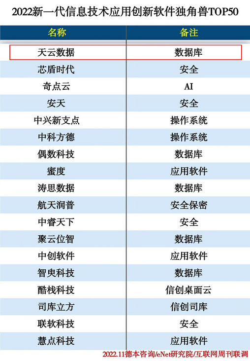 11月18日,《互联网周刊》、德本咨询、eNet研究院联合发布《2022新一代信息技术应用创新软件独角兽TOP50》榜单,天云数据、偶数科技、智臾科技、涛思数据等数据库厂商荣誉登榜,实力再度得到认可。