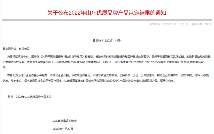 11月22日,近日,山东省质量评价协会公布2022年山东优质品牌(产品 服务)认定名单,瀚高数据库获评2022年山东优质品牌(产品),瀚高股份荣膺2022年山东优质品牌(服务)。