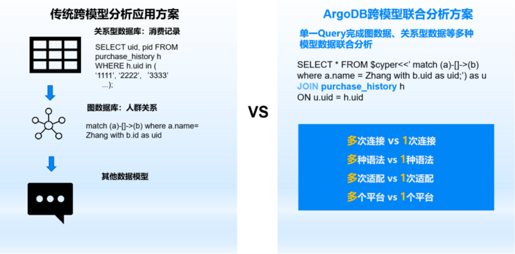ArgoDB 5.1为解决数据关联难问题,将多模型数据存储、数据融合处理能力进行迭代加强,用户可将关系型数据和图数据库进行统一存储,用户只需通过一个SQL即可关联查询分析关系型数据和图数据,在数据免搬迁、减少人工操作的同时,提升业务效率。