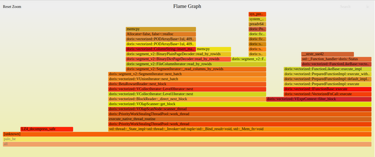并发查询测试过程中,SQL 整体执行较慢,通过抓取查询过程中的 CPU 火焰图,发现读取字符串类型数据的时候内存拷贝会占用较多时间。