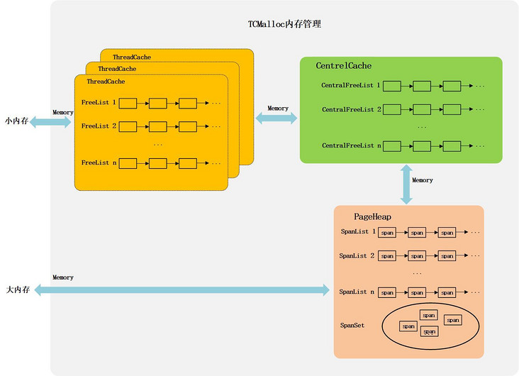 大内存的分配和释放直接通过 PageHeap 来实现,分配的内存可能来自 PageHeap 的缓存,也可能来自 PageHeap 向系统申请的新内存。PageHeap 向系统申请或释放内存时需要加锁。
