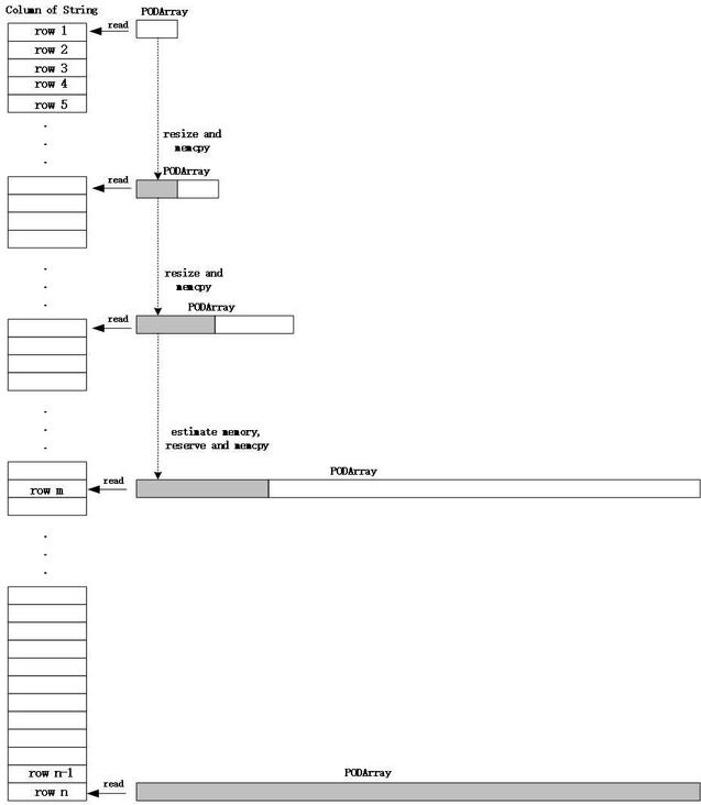 当然,该方法只是对所需的内存进行了预估,根据预估的大小提前申请了内存,减少了后面逐行读取字符串时大量的 Resize 操作,减少了内存申请和内存拷贝的次数,并不能完全消除字符串读取过程中的内存拷贝。该优化方案只对一列中字符串长度比较均匀的情况有效,内存的预估相对会比较接近实际内存。如果一列中字符串长度差别较大,该方法的效果可能不甚明显,甚至可能会造成内存浪费。