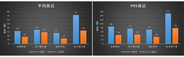 我们选择了 A/B 实验场景中一批典型的用户去重、指标求和以及协方差计算的查询 Case(SQL 总数量为 3245)对两个版本进行并发查询测试,测试表的单日分区数据大约为 31 亿(数据量大约 2 TB),查询的数据范围会覆盖最近一周的分区。测试结果如图所示,Doris 1.1.2 版本相比 Doris0.13版本,总体的平均延迟降低了大约 48%,P95 延迟降低了大约 49%。在该测试中,Doris 1.1.2 版本相比 Doris0.13 版本的查询性能提升了接近 1 倍。