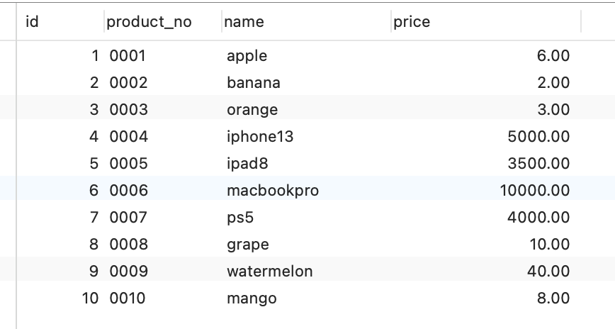 假设有一张商品表,表里有这些数据: