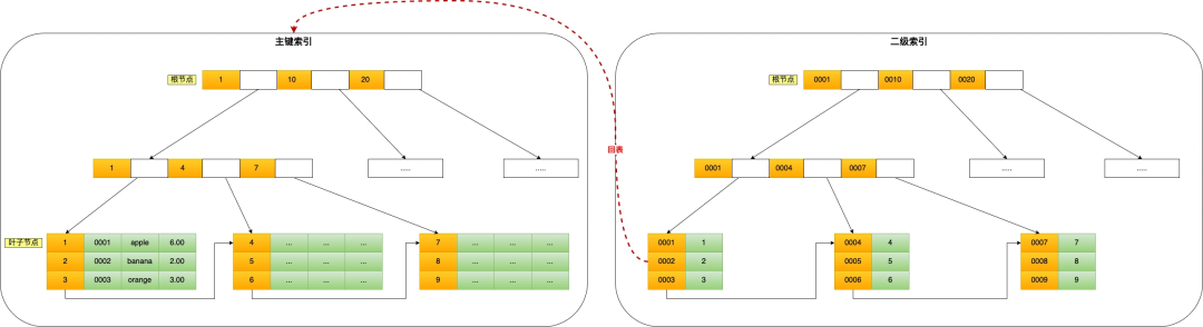 select * from product where product_no = '0002';会先在二级索引的 B+Tree 中快速查找到 product_no 为 0002 的二级索引记录,然后获取主键值,然后利用主键值在主键索引的 B+Tree 中快速查询到对应的叶子节点,然后获取完整的记录。这个过程叫「回表」,也就是说要查两个 B+Tree 才能查到数据。如下图: