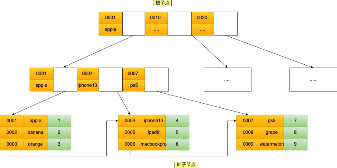 我这里将前面的商品表中的 product_no (商品编码)字段设置为二级索引,那么二级索引的 B+Tree 如下图,其中非叶子的索引值是 product_no(图中橙色部分),叶子节点存储的数据是主键值(图中绿色部分)。