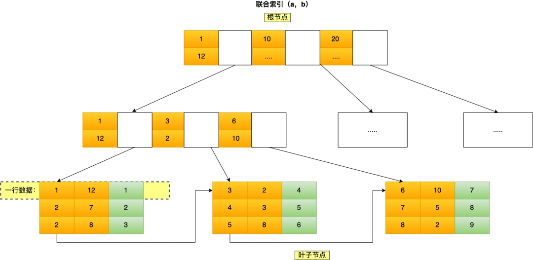 我这里举联合索引(a,b)的例子,该联合索引的 B+ Tree 如下: