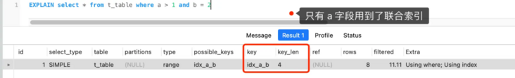 通过 Q1 查询语句我们可以知道,a 字段使用了 > 进行范围查询,联合索引的最左匹配原则在遇到 a 字段的范围查询( >)后就停止匹配了,因此 b 字段并没有使用到联合索引。