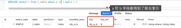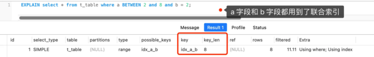 可以看到 key_len 为 8 字节,说明优化器使用了 2 个字段的查询条件来形成扫描区间的边界条件,也就是 a 和 b 字段都用到了联合索引进行索引查询。