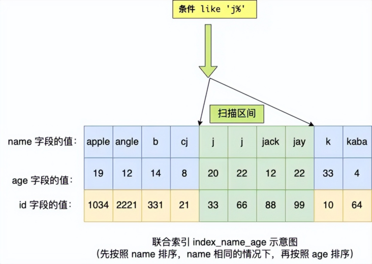 通过 Q4 查询语句我们可以知道,虽然 name 字段使用了 like 前缀匹配进行范围查询,但是联合索引的最左匹配原则并没有在遇到 name 字段的范围查询( like 'j%')后就停止匹配了,age 字段还是可以用到了联合索引的。