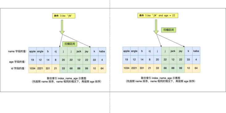 于是,在确定需要扫描的二级索引的范围时,当二级索引记录的 name 字段值为 ‘j’ 时,可以通过 age = 22 条件减少需要扫描的二级索引记录范围(age 字段可以利用联合索引进行索引查询的意思)。也就是说,从符合 name = 'j' and age = 22 条件的第一条记录时开始扫描,而不需要从第一个 name 为 j 的记录开始扫描 。如下图的右边: