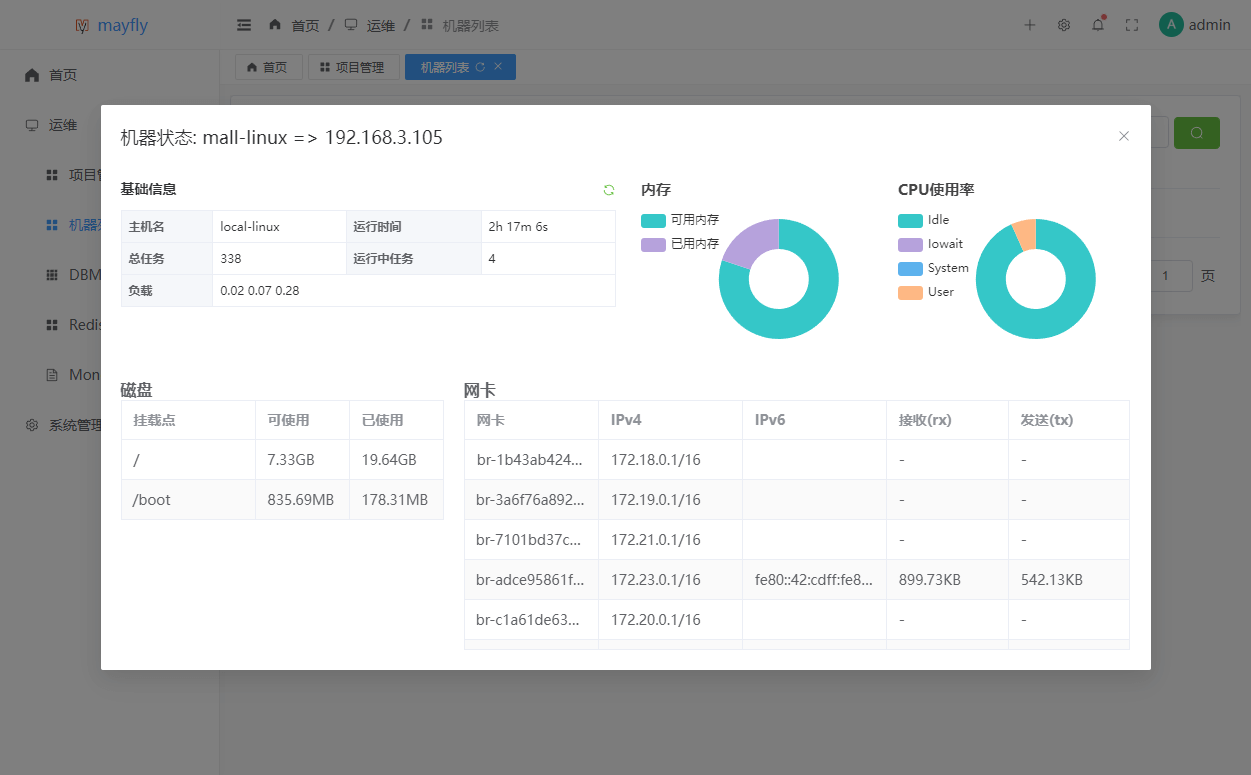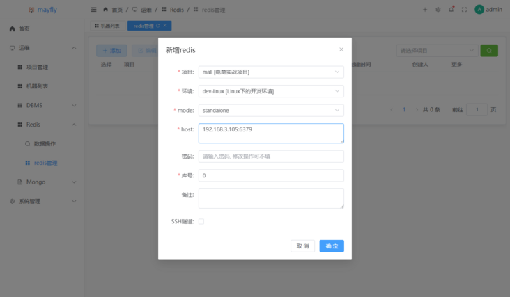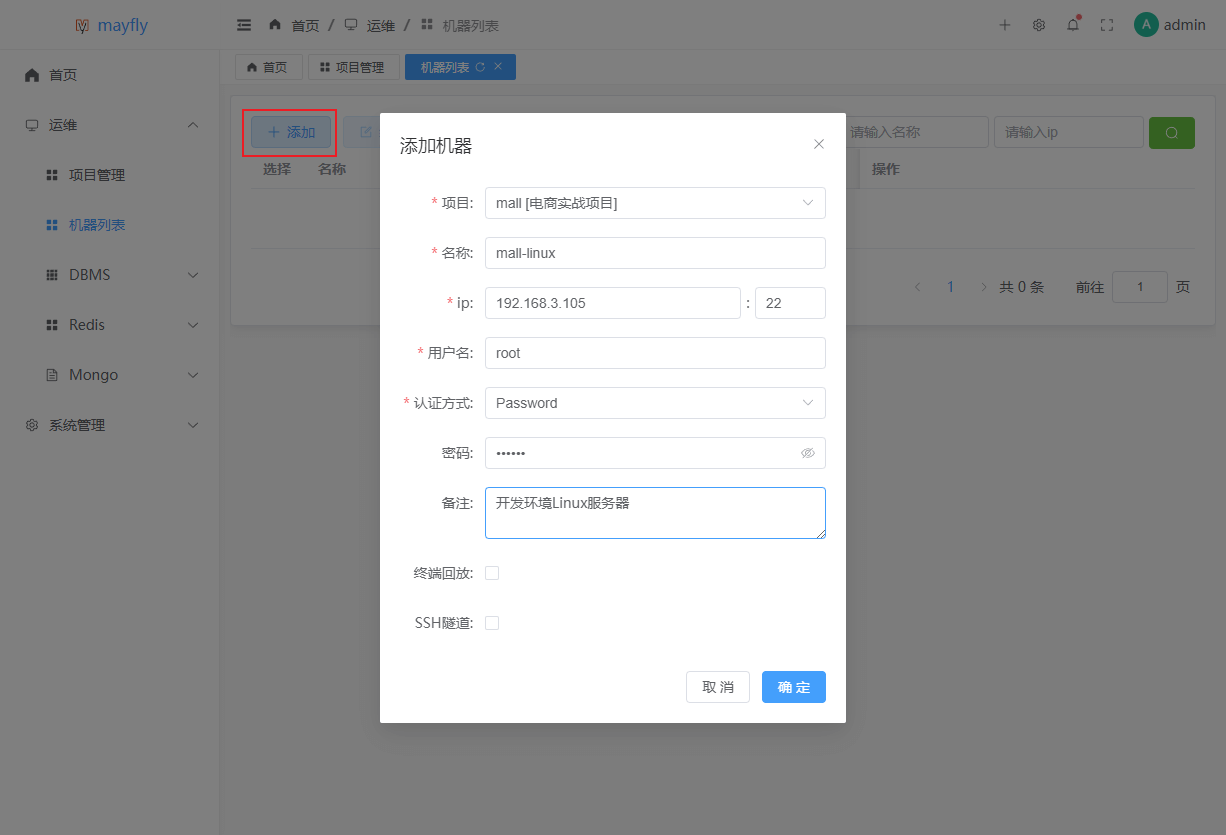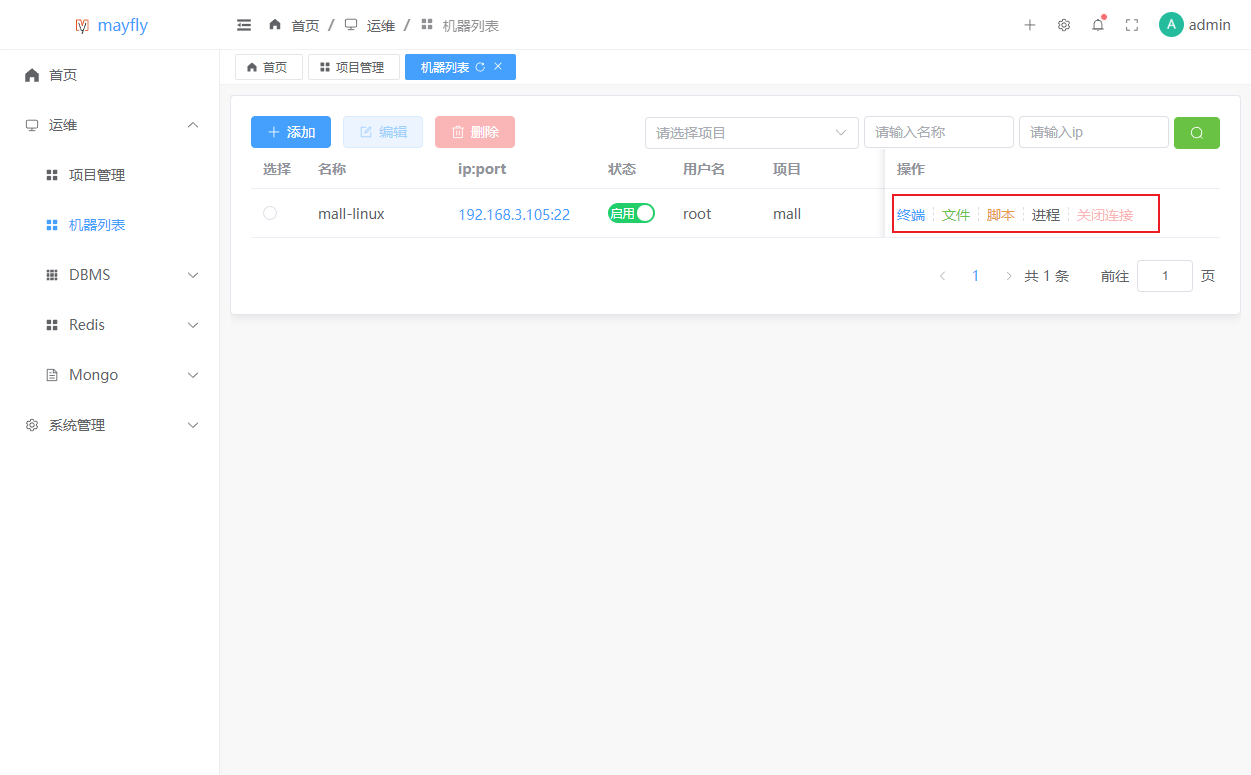 admin,至此就可以开始使用mayfly-go来管理服务器了。机器管理